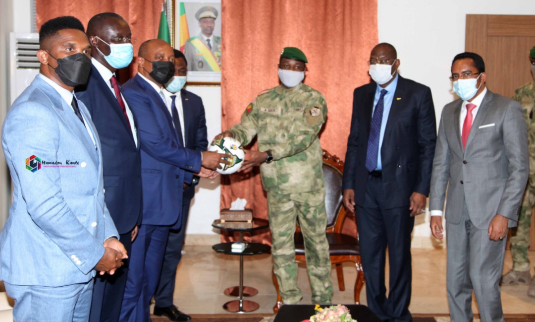 C’est au environ de 21 heures que le Colonel Assimi Goïta a reçu au Palais de Koulouba la forte délégation de la CAF conduite par son Président Patrice Motsepe. Me Augustin Senghor (1er vice-président), Veron Moussingo Omba (secrétaire général) et Samuel Eto’o (Président de la Fédération Camerounaise de Football) accompagnaient le patron de football africain.